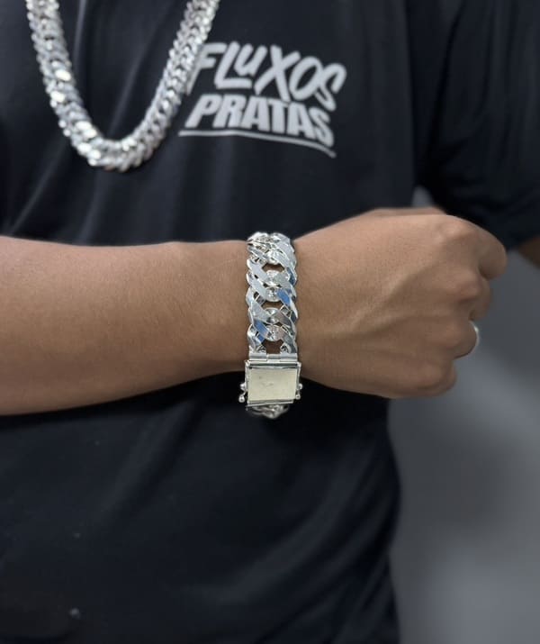 Joias em Pratas 925, Garantia Vitalícia O preço original era: R$ 900,00.R$ 650,00O preço atual é: R$ 650,00.Pulseira 17mm 21cm Elo duplo fecho mosquetão