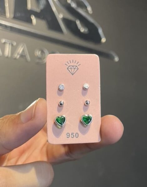 Trio De Brincos Modelo Pedra Coração Verde Água